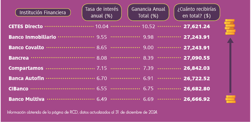 Para ilustrarlo, te presentamos un recuadro donde se compararon inversiones a un plazo de 28 días durante un año, con un monto de $25 mil pesos, obteniendo los siguientes resultados: